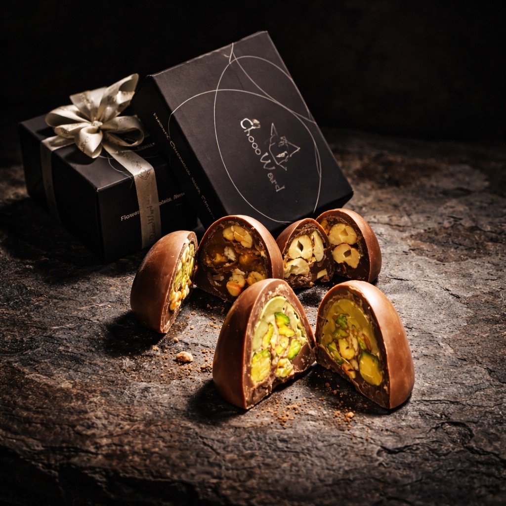 Premium Belgian chocolate with Mix Nuts Pistachios, almonds, cashews beautifully arranged in an elegant box 500 G.