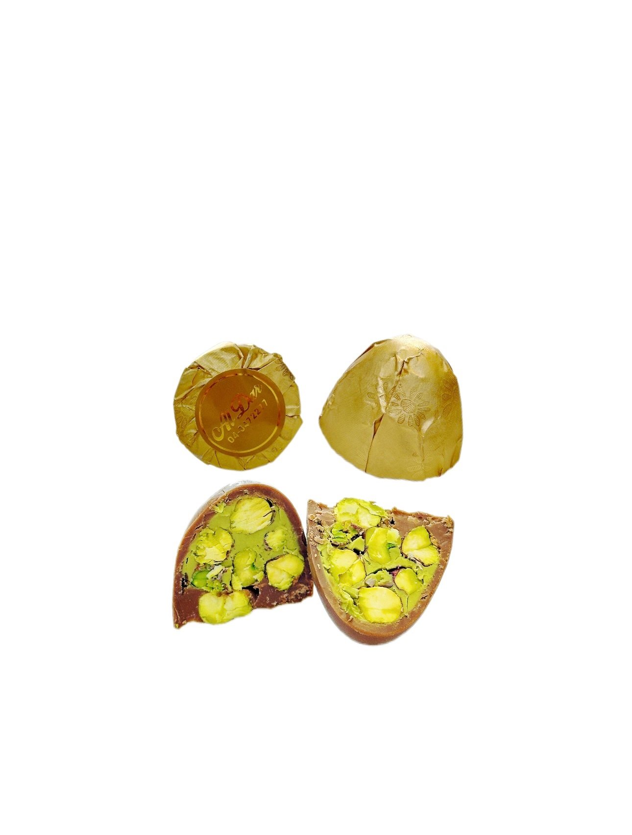Indulge in an unforgettable, luxurious taste with this exquisite piece of milk chocolate, generously filled with whole, crunchy pistachios. It comes wrapped in elegant gold foil, adding a touch of sophistication, perfect for gifting or serving at upscale events.